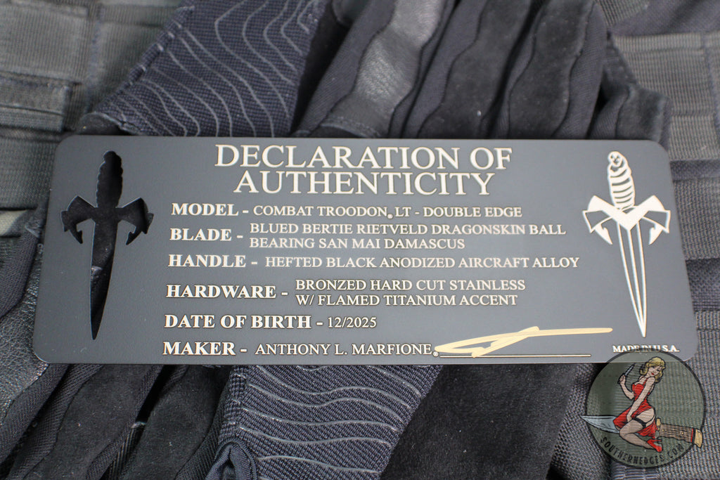 Marfione Custom Combat Troodon- Gen III- Double Edge- Black Deep Engraved Chassis- Blued Bertie Reitveld Dragonskin Ball Bearing Damascus Compound Ground Blade 1142-16 BRBLKBZFL-MCK V2