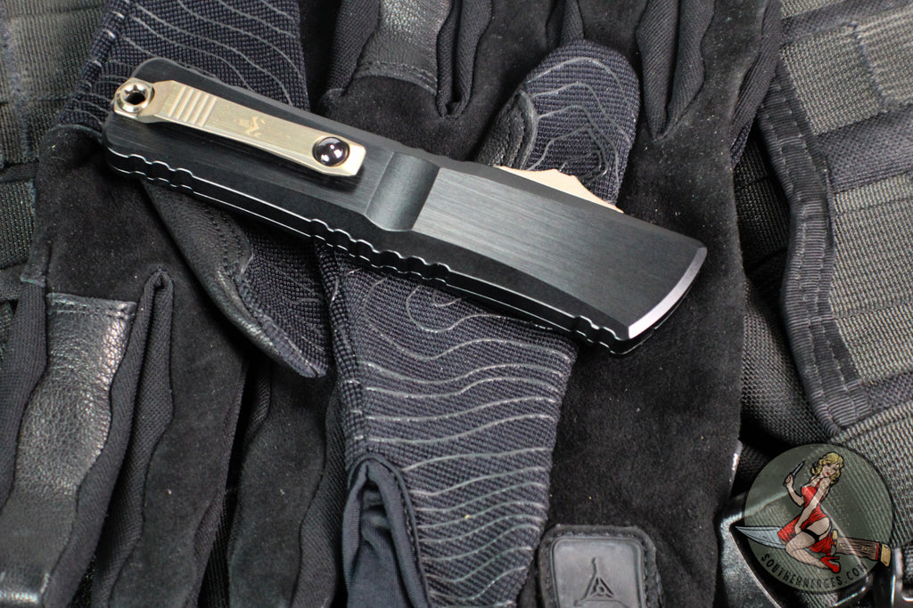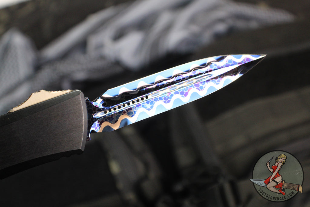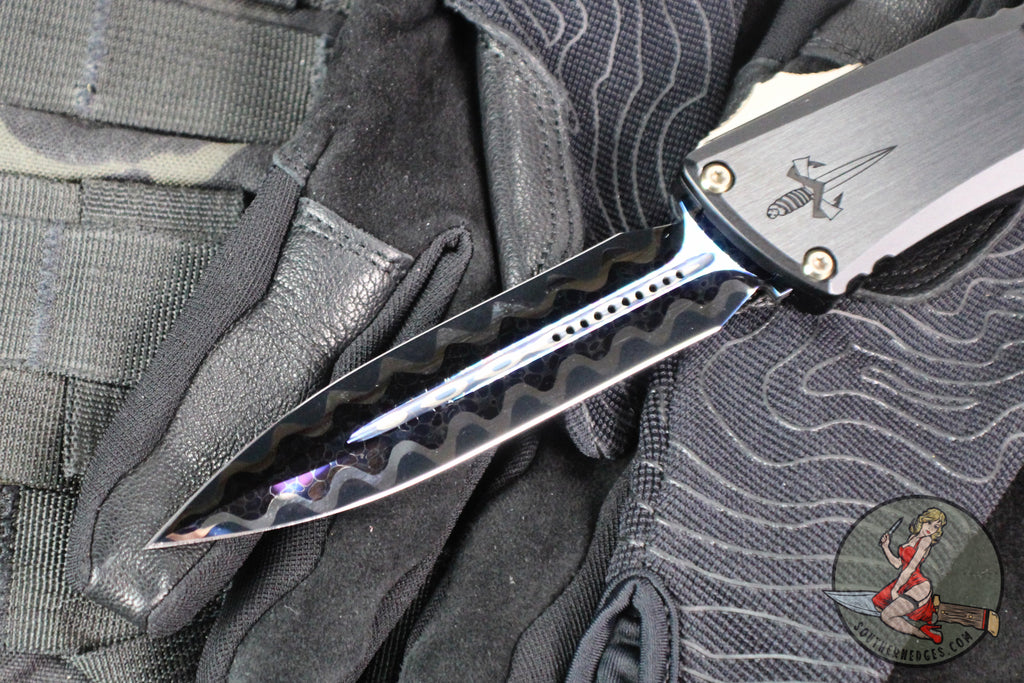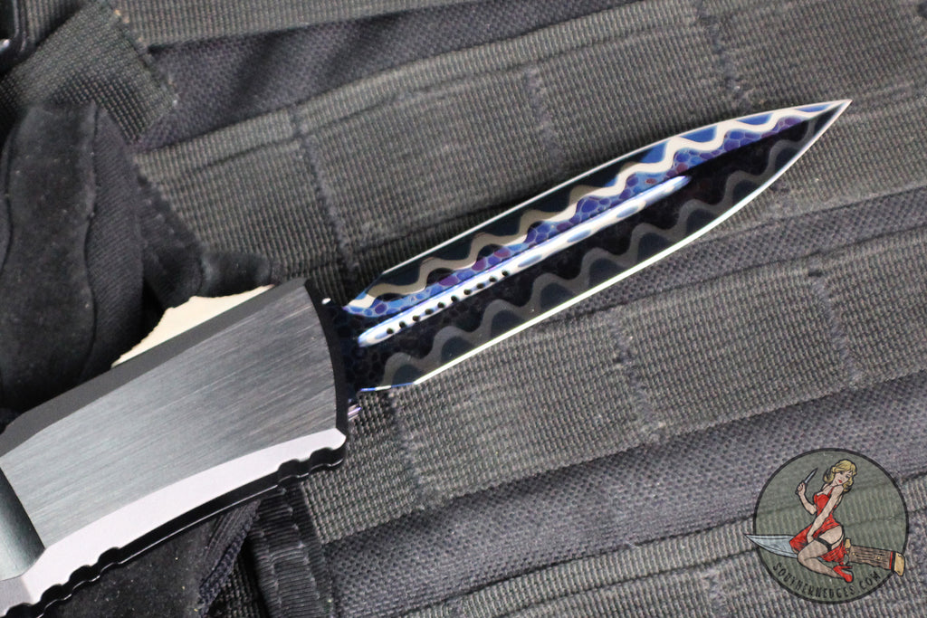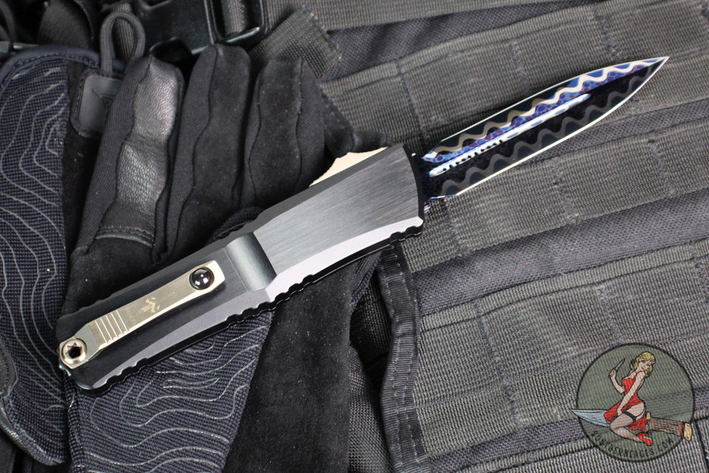 Marfione Custom Combat Troodon. Double Edge (D/E) Blade profile with M390 steel Mirror Polished blade. Blue Chip Hardware on this great knife. Double action Out the Front (OTF) knife. Black anodized 6061-T6 aluminum handle has deep logo engraved.