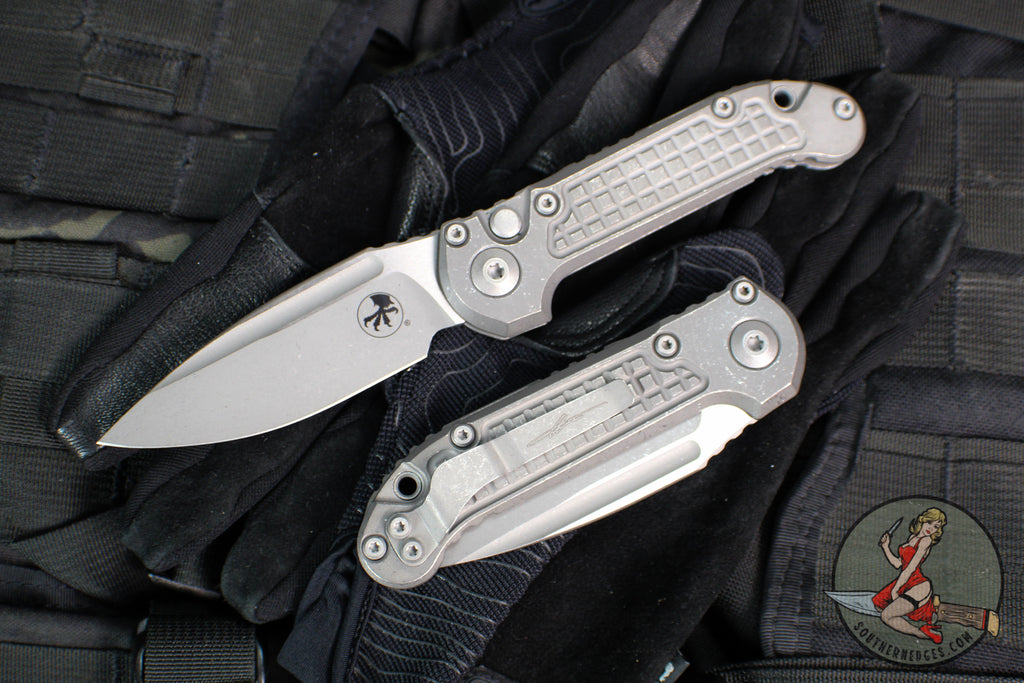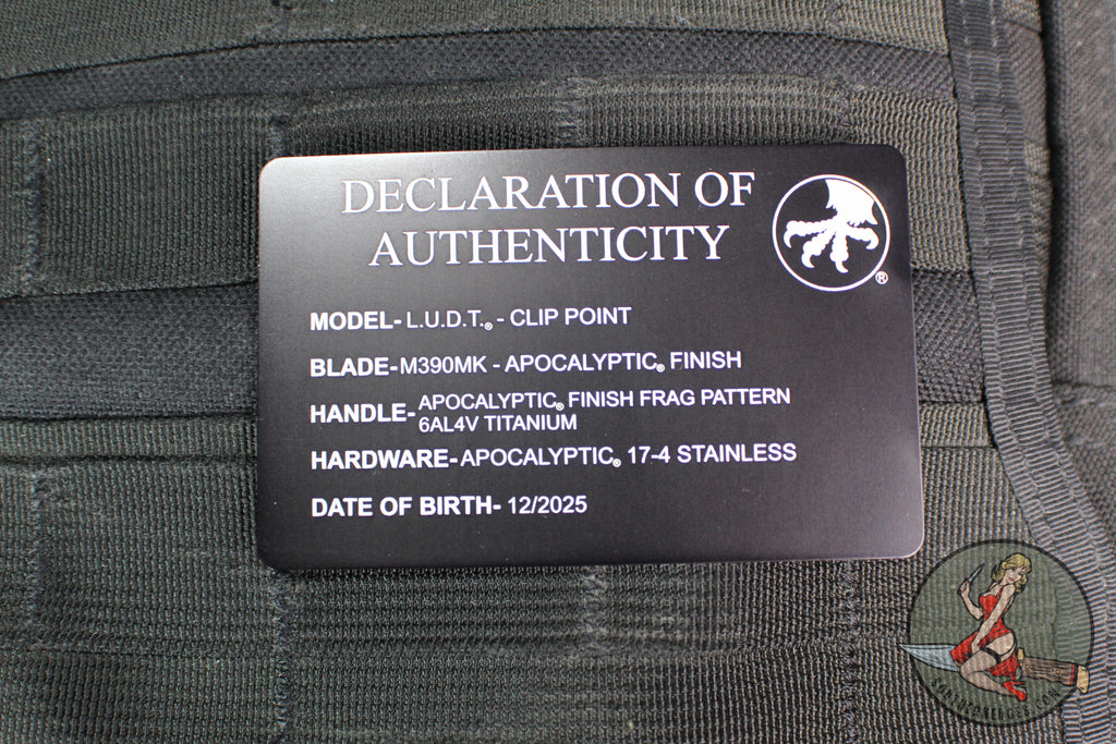 Microtech LUDT side-opening knife with Apocalyptic finished frag pattern Titanium handle. This LUDT has a Apocalyptic finished M390MK steel plain edge blade. Apocalyptic finished Titanium accent.