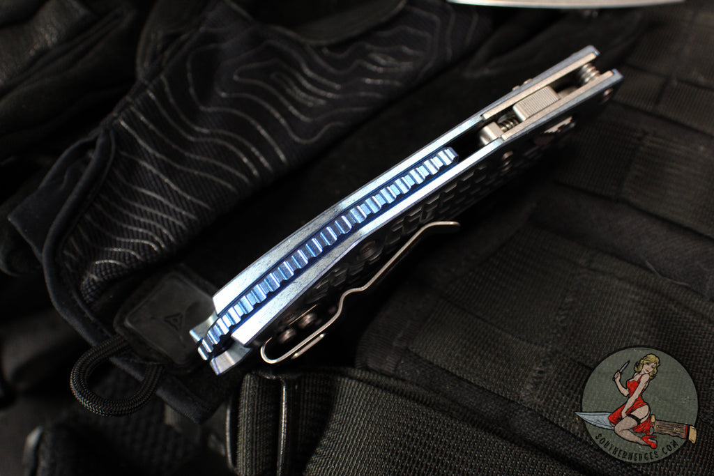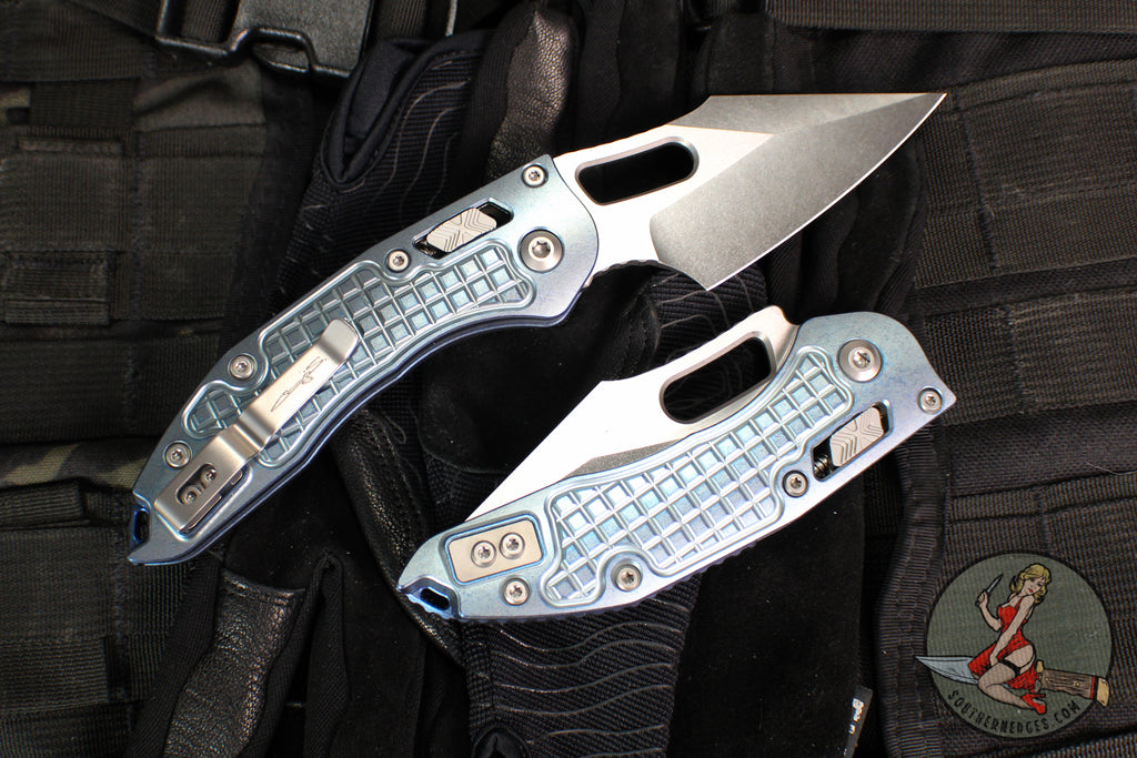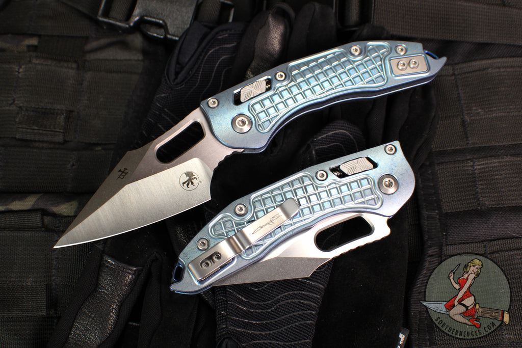 The Microtech Stitch is a production version of the Custom knife collaboration between Marfione and Borka Blades in the new Ram Lok format. Ice Blue Anodized Frag pattern Titanium handle and Stonewash finished M390MK steel blade. 3.75" Blade, 8.5" overall. Tip up carry. Side opening blade.