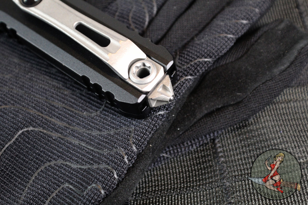 Black Double Edge (D/E) Ultratech with apocalyptic blade finish and standard hardware. Double action Out the Front (OTF) knife. Black anodized 6061-T6 aluminum handle with M390 steel blade.