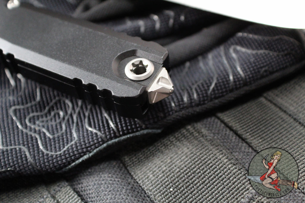 Black Single Edge (S/E) Ultratech with stonewash blade finish and standard hardware. Double action Out the Front (OTF) knife. Black anodized 6061-T6 aluminum handle with M390 steel blade.