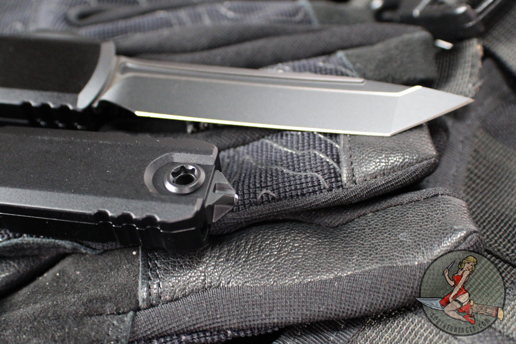 Black finished Tanto Edge (T/E) Ultratech with Black blade finish and Black hardware. Double action Out the Front (OTF) knife. Black finished 6061-T6 aluminum handle with M390 steel blade.