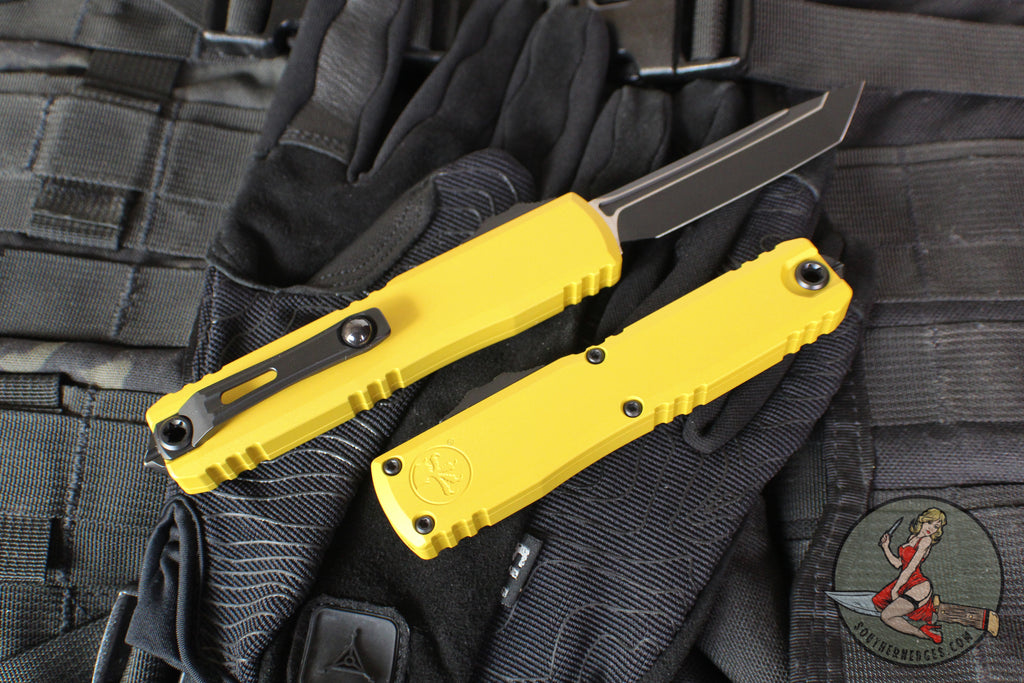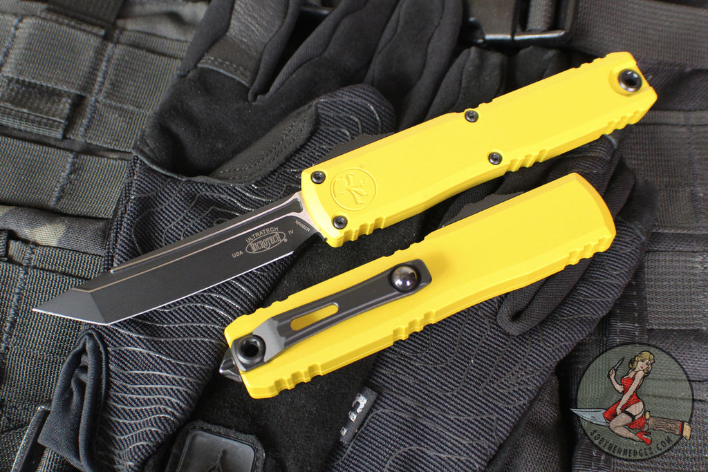 Microtech Ultratech OTF Knife- GEN IV- Tanto Edge- Yellow Handle- Black Finished Plain Edge Blade 11234-1 YW