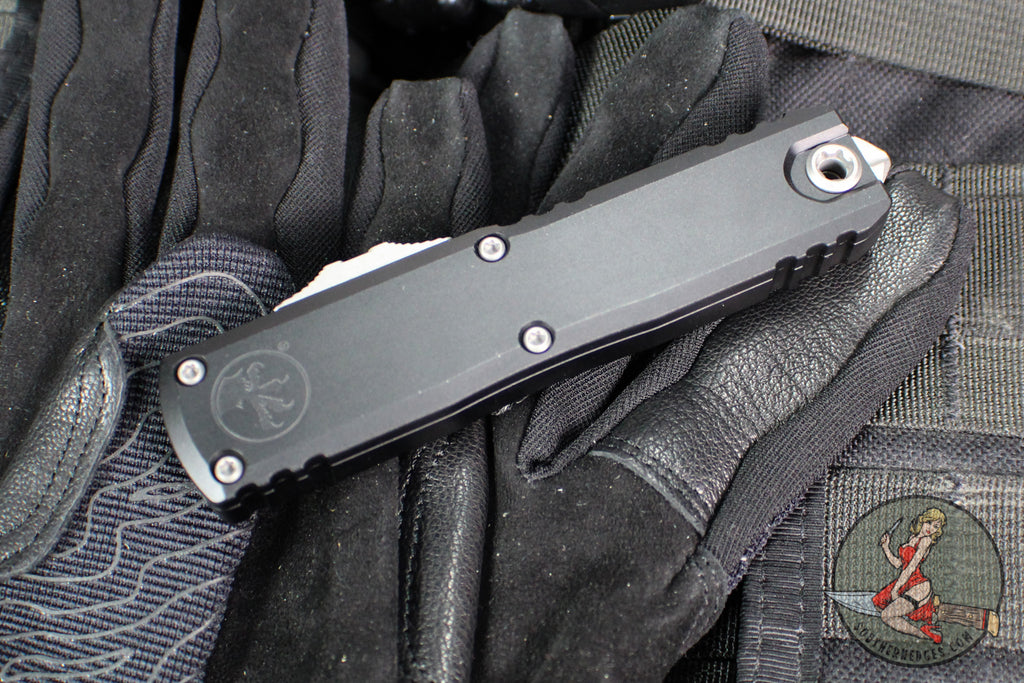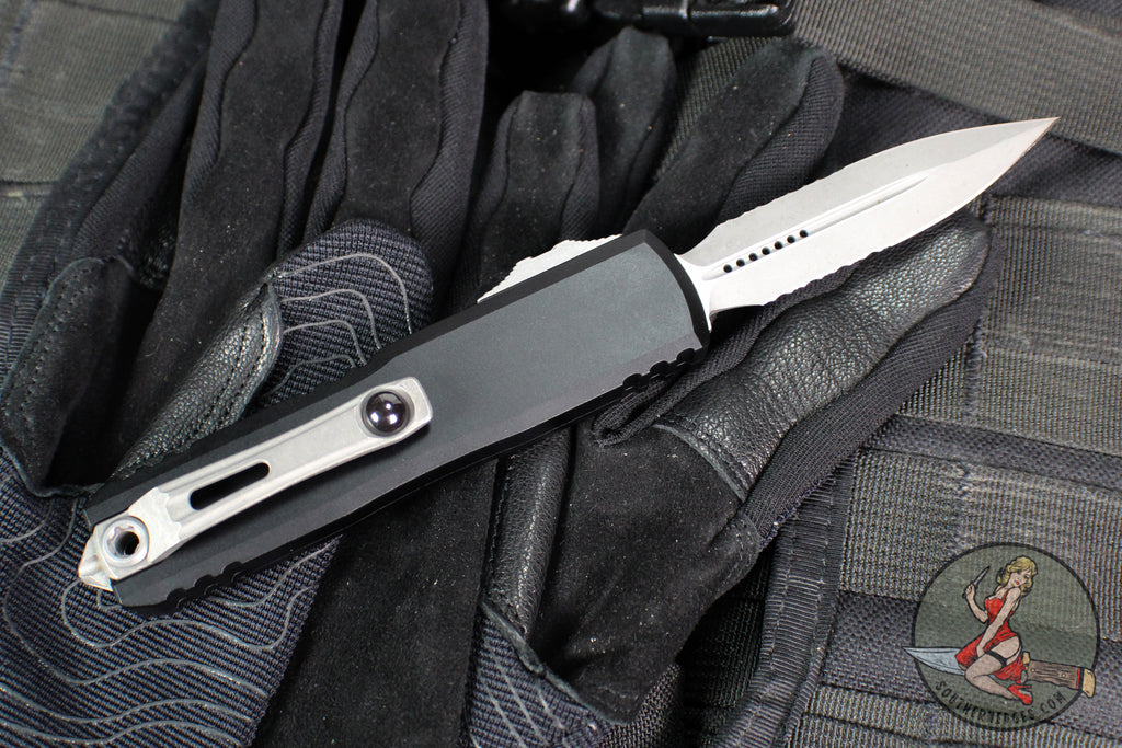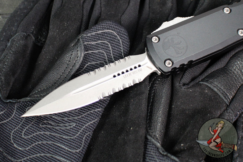 Microtech UTX-85 OTF Knife- GEN IV- Double Edge- Black Handle- Apocalyptic Finished Part Serrated Blade 12324-11 AP