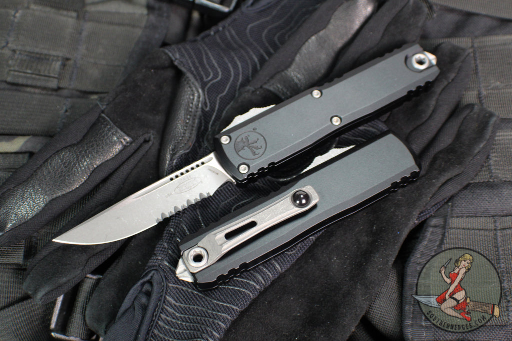Microtech UTX-85 OTF Knife- GEN IV- Single Edge- Black Handle- Apocalyptic Part Serrated Blade 12314-11 AP