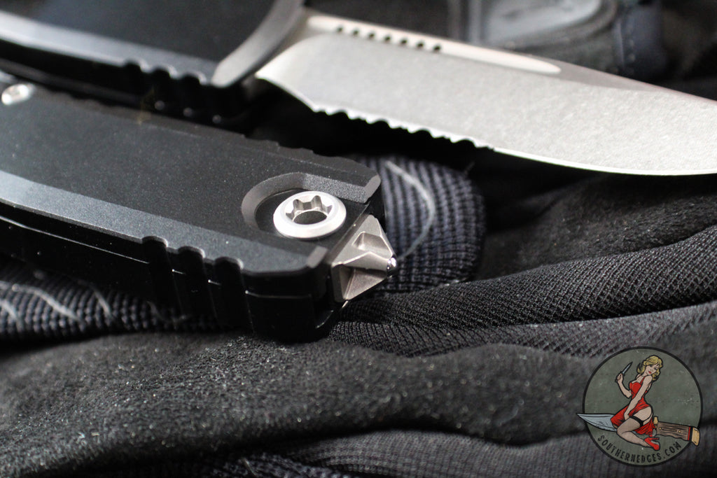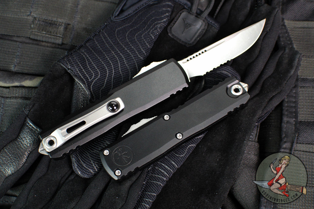 Microtech UTX-85 OTF Knife- GEN IV- Single Edge- Black Handle- Stonewash Part Serrated Blade 12314-11