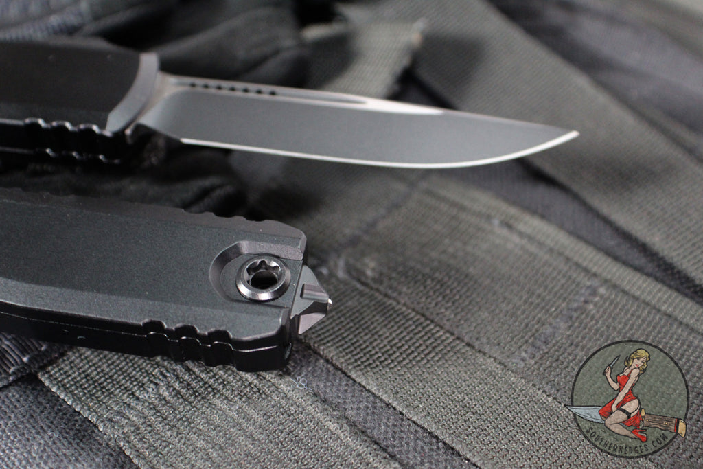 Black finished Single Edge (D/E) UTX-85 with Black blade finish. Double action Out the Front (OTF)  knife. Black finished 6061-T6 aluminum handle with Black finished M390 steel blade.