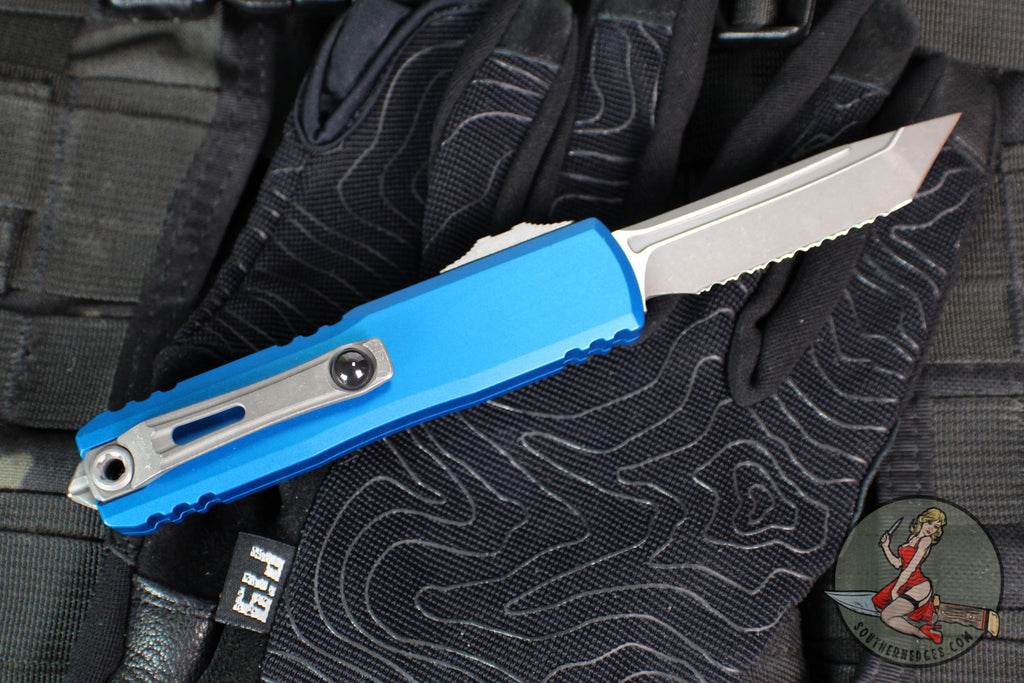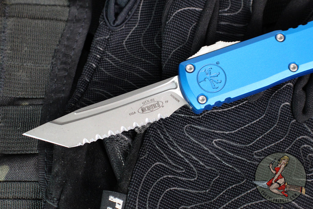 Microtech UTX-85 OTF Knife- GEN IV- Tanto Edge- Blue Handle- Apocalyptic Full Serrated Blade 12334-12 APBL
