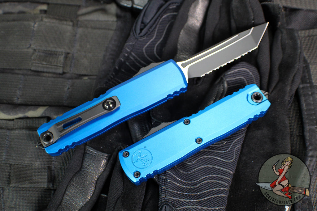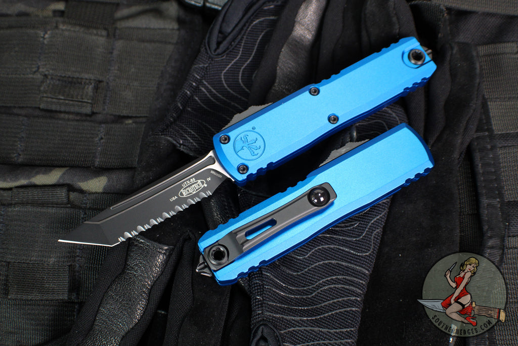 Microtech UTX-85 OTF Knife- GEN IV- Tanto Edge- Blue Handle- Black Finished Full Serrated Blade 12334-3 BL