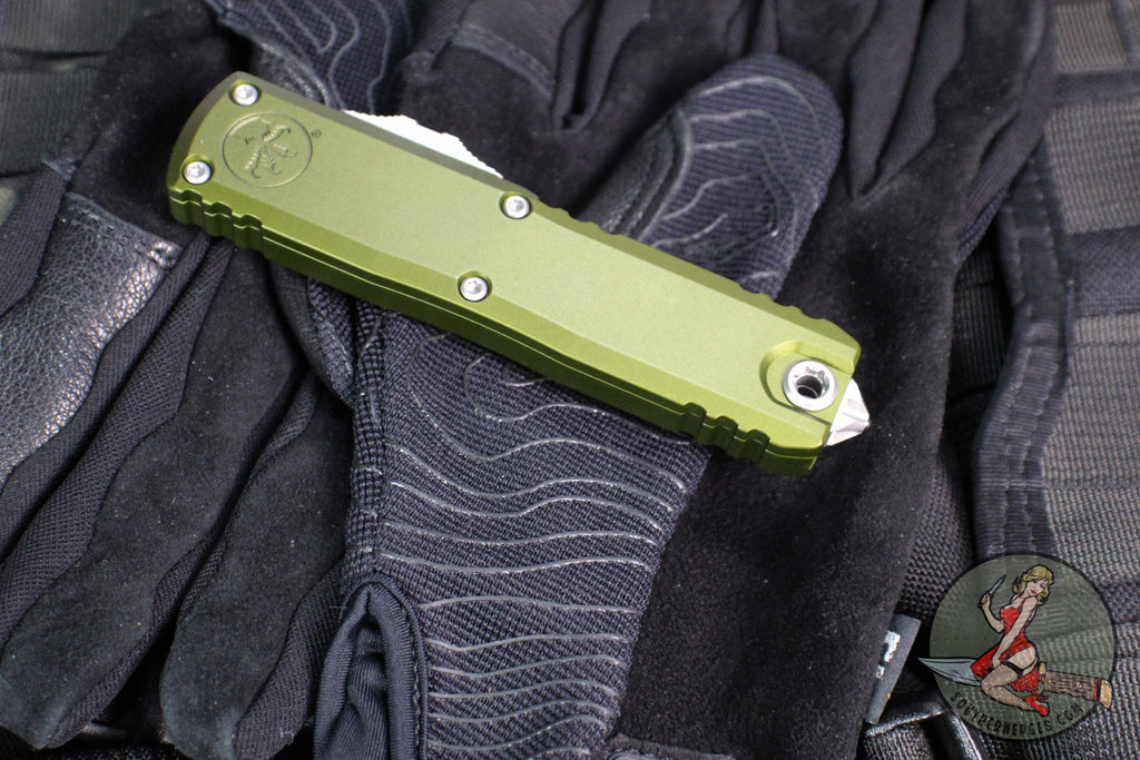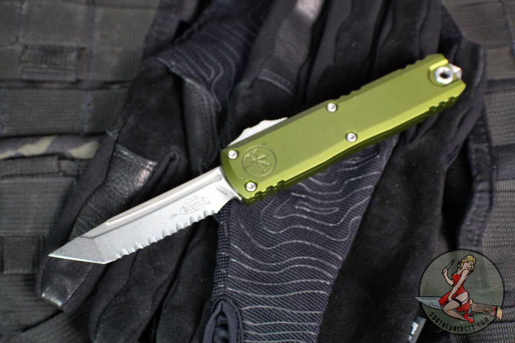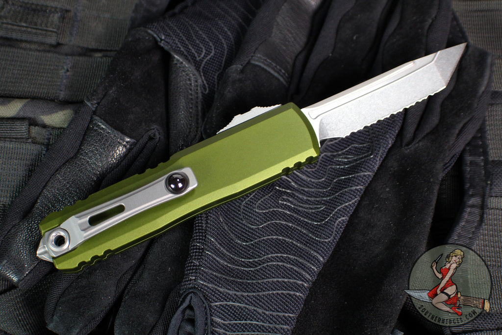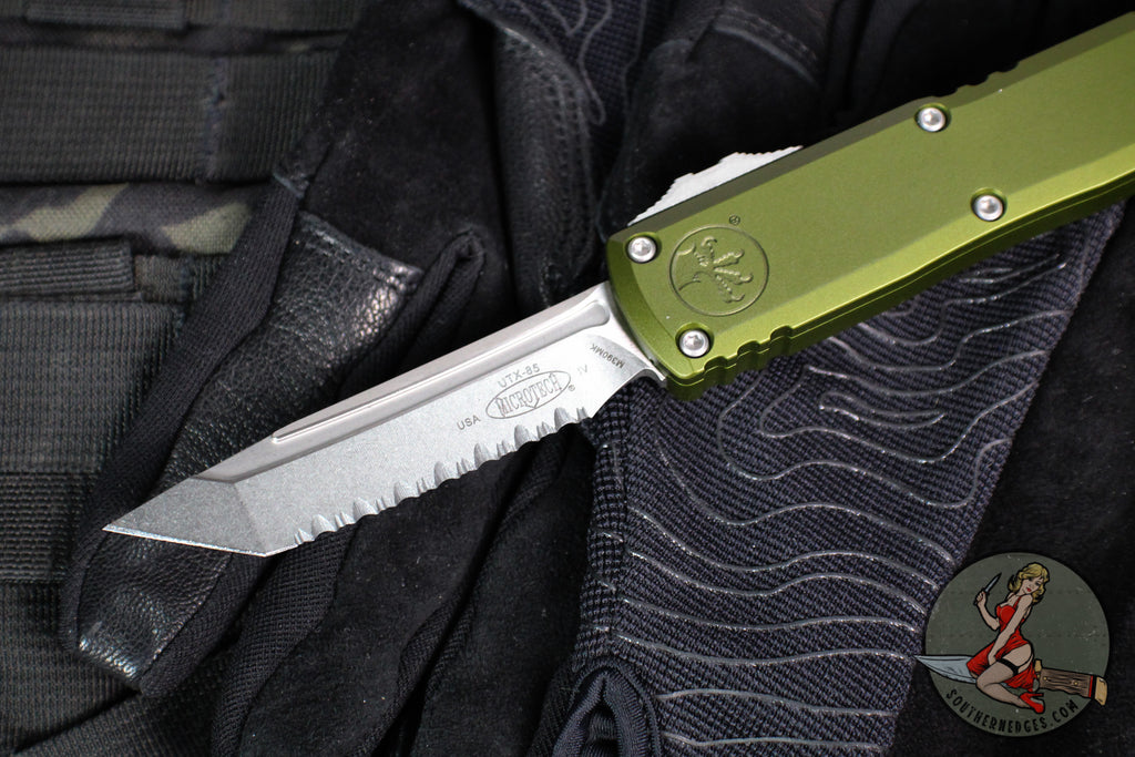 Microtech UTX-85 OTF Knife- GEN IV- Tanto Edge- OD Green Handle- Stonewash Full Serrated Blade 12334-12 OD