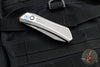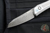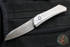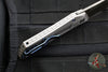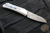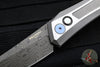 Protech Auto Oligarch collaboration with Sinkevich Design. Out The Side (OTS) Auto Knife with Stainless Steel Handle with Black Lip Pearl Inlaid Button and Nichols Virus pattern Damascus Blade. Blue Titnium accents and Clip.