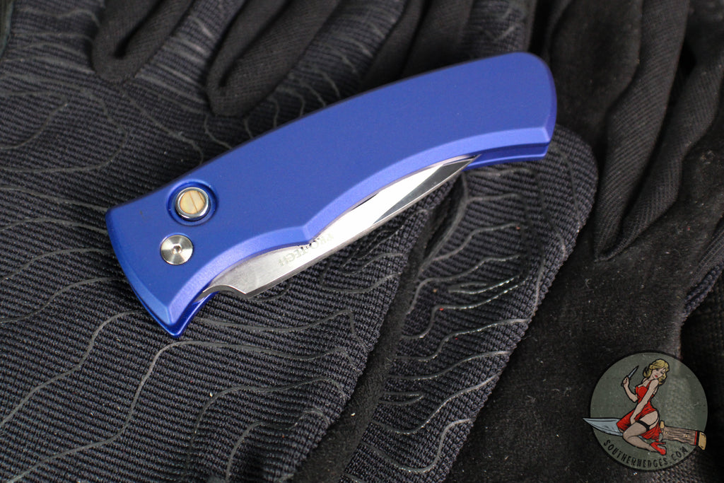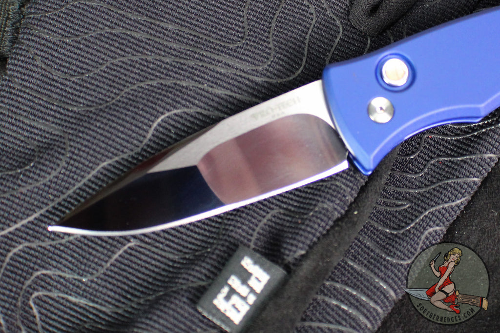 Protech Auto Duke 2 Out The Side (OTS) Auto Knife with Blue finished Aluminum Handle With special Mike Irie Compound Ground Mirror polished blade. Abalone inlaid button and satin finished clip.