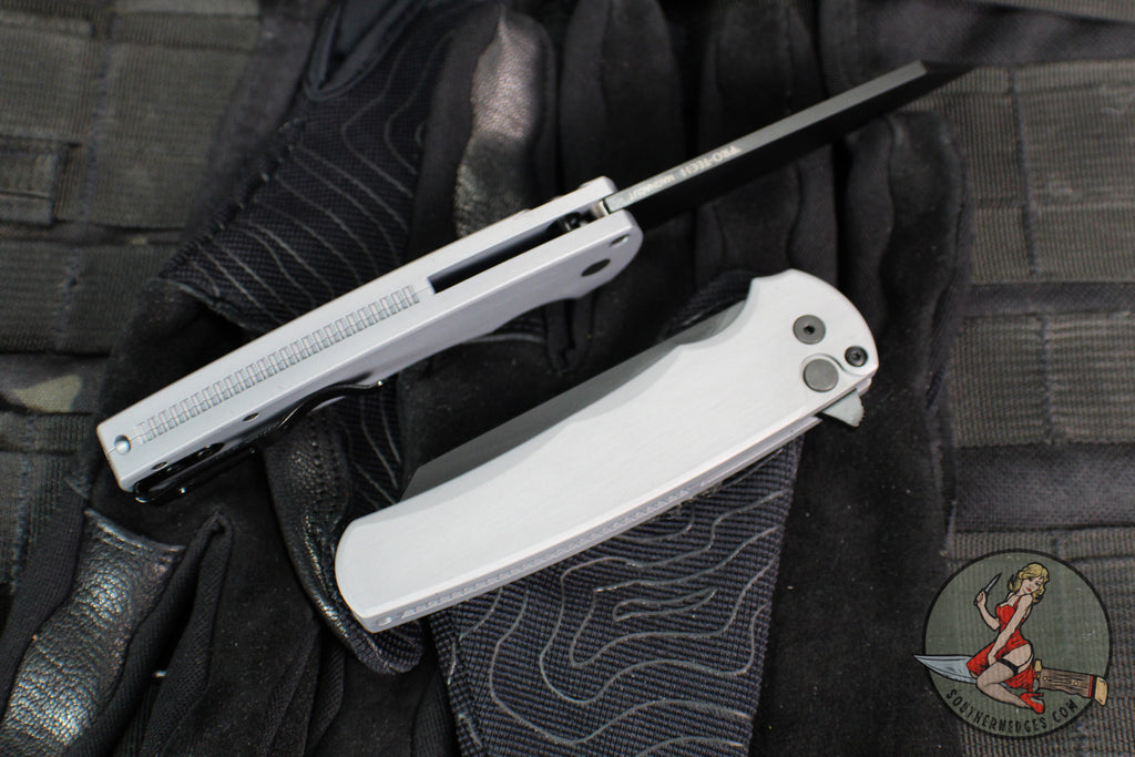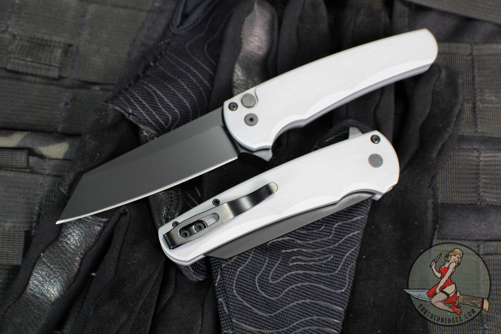 Protech Malibu Flipper. Grey Handle with Reverse Tanto Style plain edge Black DLC Blade. 6061-T6 Aluminum Handle and Magnacut Blade Steel.