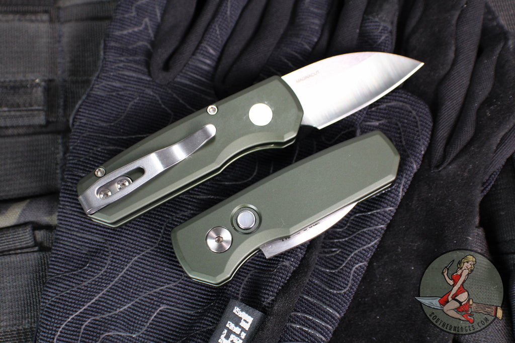 Protech Runt Green Out The Side (OTS) Auto Knife. Satin finished Magnacut Whanrcliffe with a plain edge. Green anodized 6061-T6 aluminum body.