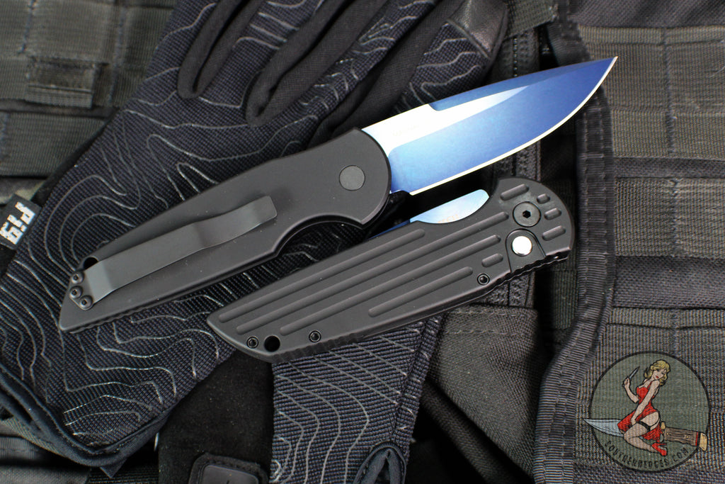 Protech TR-3 Tactical Response 3 Out The Side (OTS) Auto Knife. This model has black Aluminum grooved Handles with Sapphire Blue finished Magnacut Blade.