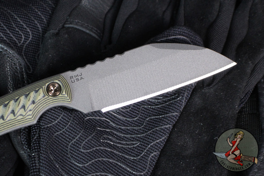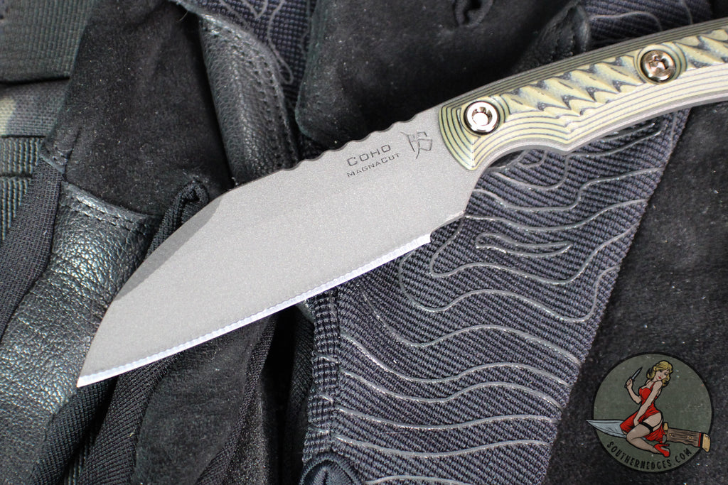 RMJ Coho- Small EDC Knife- Tungsten Gray- Dirty Olive G-10 Handle- MAGNACUT