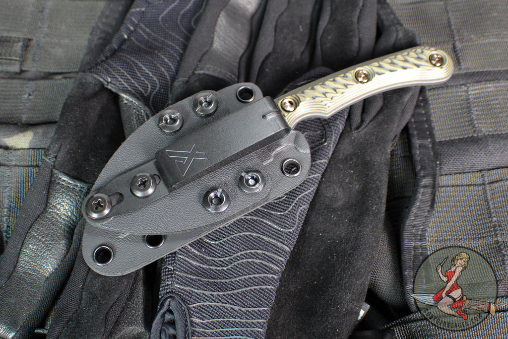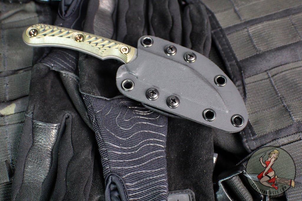 RMJ's EDC Concealable small fixed blade with a great Wharncliffe style blade. Tungsten Grey Cerakoted blade with removable Hyena Brown G-10 set of handles.